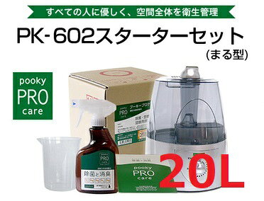 商品名 プーキープロケア PK-602 20L スターターセット 噴霧器 (まる型) セット内容 ミスト噴霧器(まる型)、POOKY PRO CARE 10L替えタンク、専用スプレーボトル、希釈用メジャーカップ、ハンドブック 商品説明 除菌・消臭したい「空間」に設置。