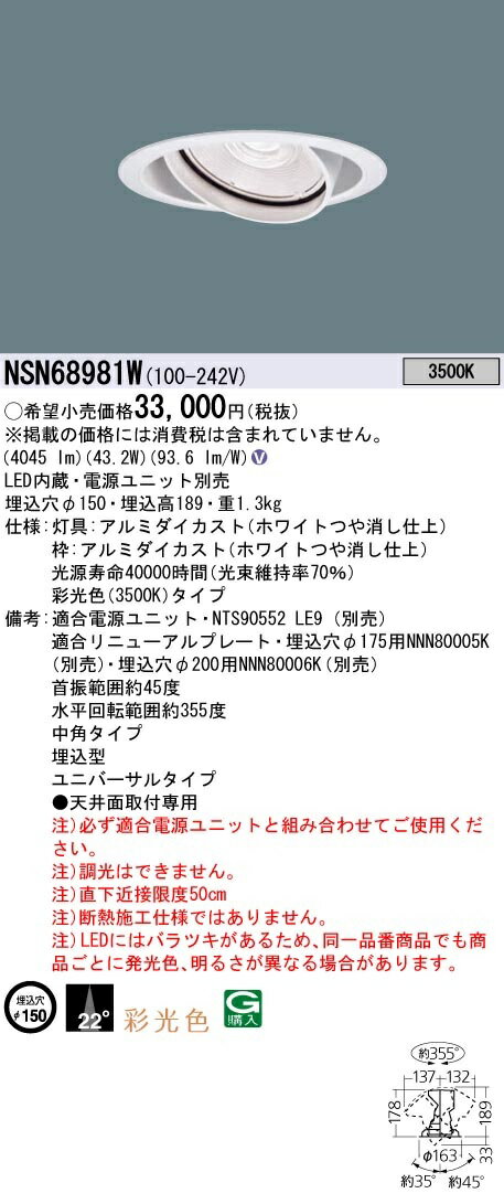 【最安値挑戦中!最大34倍】パナソニック NSN68981W ユニバーサルダウンライト 電源ユニット別売 天井埋込型 LED 彩光色 埋込穴φ150 LED550形 [∽]