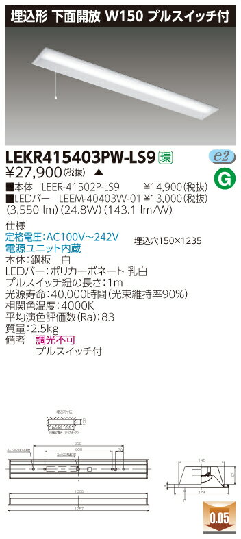 【最安値挑戦中!最大34倍】東芝 LEKR415403PW-LS9 ベースライト TENQOO埋込40形 下面開放 W150 LED(白色) 電源ユニット内蔵 非調光 受注生産品 [∽§]